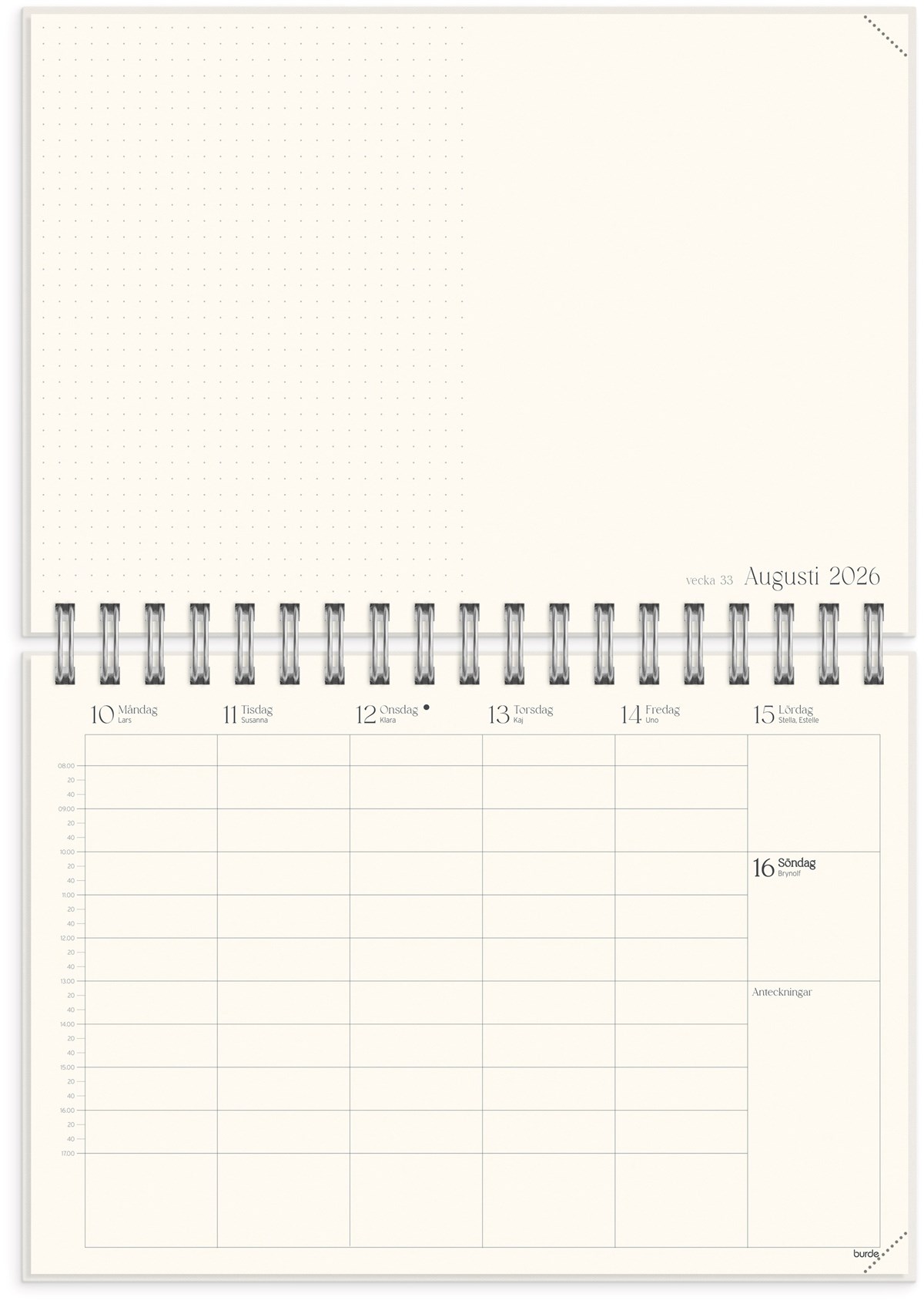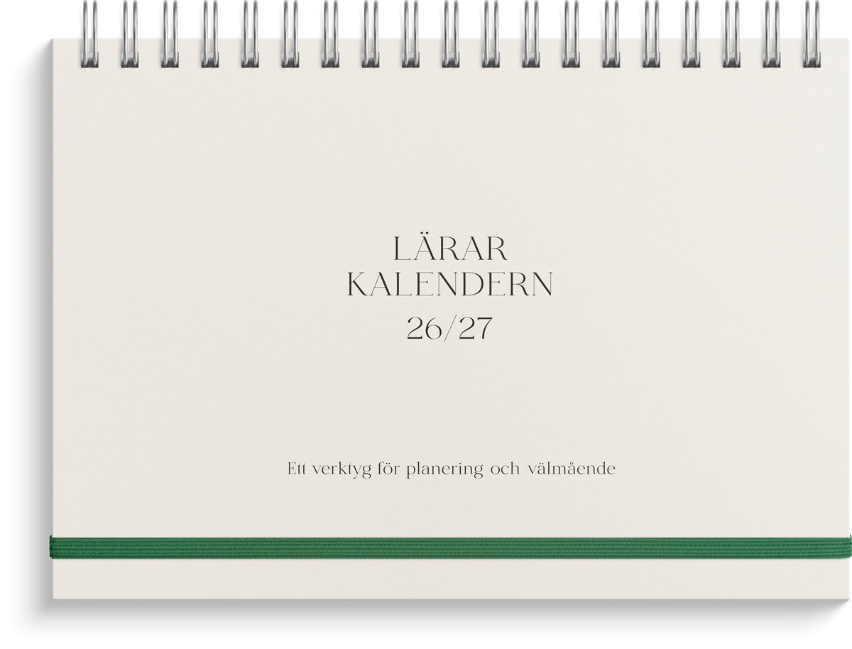 Format: B5 (176x250 mm). Mått: 195 x 20 x 254 mm. Layout: Vecka/uppslag. Stående. Timindelning 8-17. Kalendarium: 2026-06-08 - 2027-07-25. Omslag: Kartong med struktur. Spiralbunden. Detaljer: Gummiband. Plastficka. Innehåll: Flaggdagar, helgdagar/aftnar, månfaser, namnsdagar, temadagar/händelser, årsplan/årsplaner, anteckningssidor, reflektioner, schema, elevfrånvaro, elevförteckning. Antal sidor: 208. Miljöinformation: FSC®.