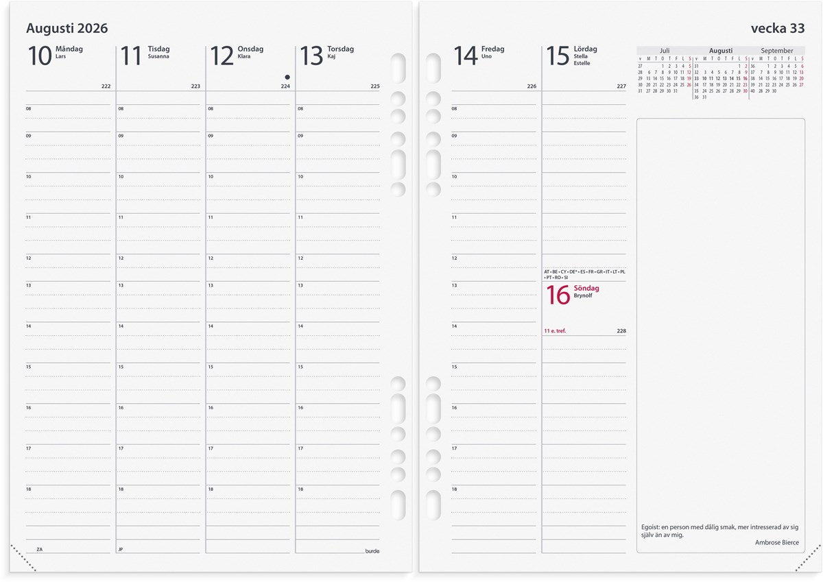 Format: A5. Layout: Stående. Vecka/uppslag. Timindelning 8-18. Kalendarium: 2025-11-24 - 2027-01-03. Omslag: Kartong. Detaljer: Flyttbar plastlinjal. Innehåll: Kassabok, Kyrkliga helgdagar, Flaggdagar, Helgdagar/aftnar, Internationella helgdagar, Månfaser, Flyttbar markör/linjal, Namnsdagar, Anteckningssidor rutiga, Anteckningssidor linjerade, Internationella helgdagar översikt, Register, Register a-ö, Telefonregister, Temadagar/händelser, Att kontakta, To-do, Årsöversikt/årsöversikter, Årsplan/årsplaner. Antal sidor: 192. Miljöinformation: FSC®.