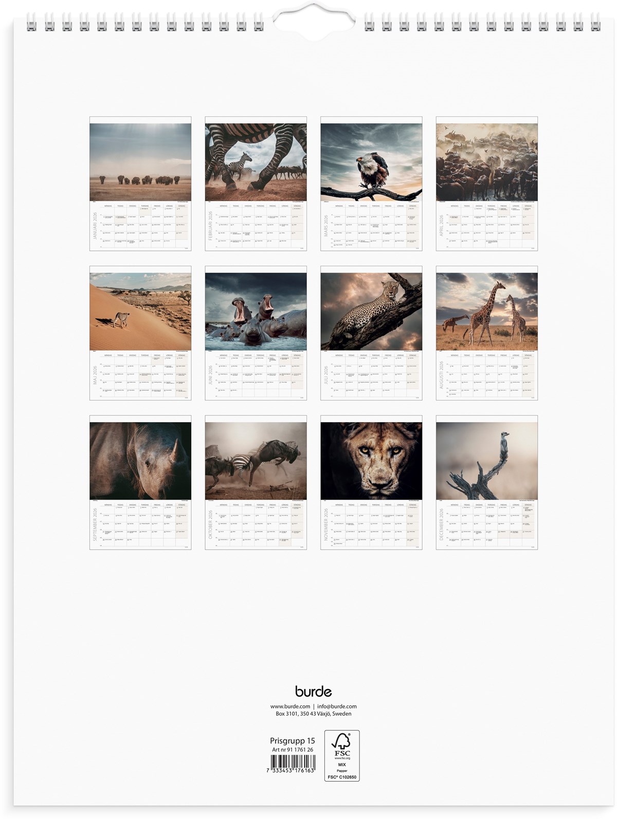 Format: 295x390 mm. Layout: Månad/blad. Kalendarium: 2026-01-01 - 2026-12-31. Spiralbunden. Innehåll: Flaggdagar, Helgdagar/aftnar, Månfaser, Namnsdagar, Temadagar/händelser. Antal sidor: 12. Miljöinformation: FSC®.