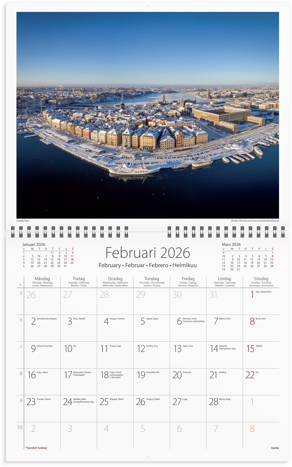 Väggkalender med tolv bilder från vår huvudstad, den är femspråkig (svenska, engelska, tyska, spanska och finska) och har svenska namnsdagar.