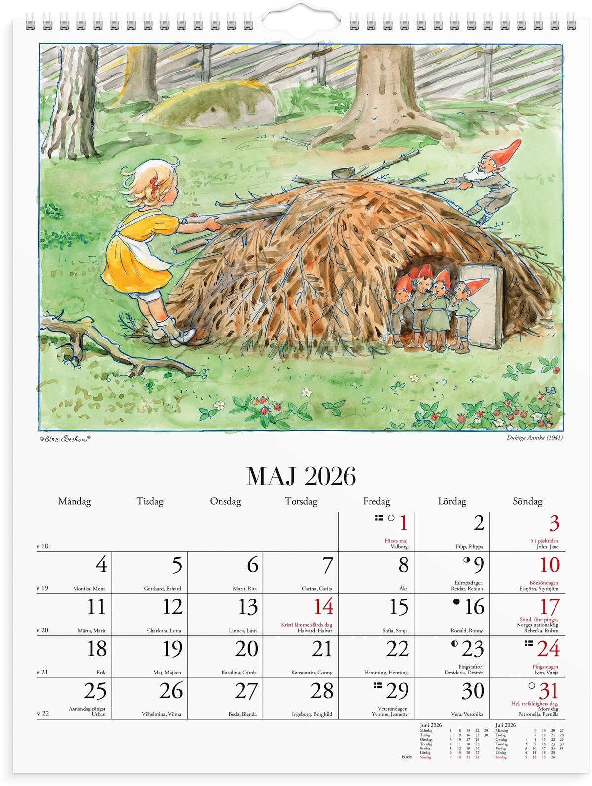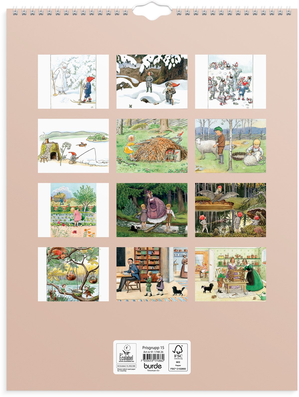 Elsa Beskow är en svensk barnboksförfattare och illustratör vars bilder har kommit att betyda barndom för många. Denna väggkalender funkar utmärkt för en överskådlig planering av vardagen. Månaderna matchas med passande bilder från Elsa Beskows välkända barnböcker. Kalendern är femspråkig (svenska, engelska, tyska, spanska och finska) men har svenska namnsdagar.