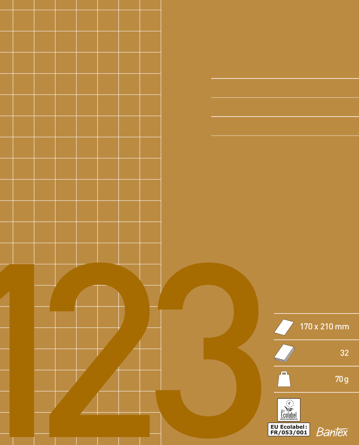 Skolhäfte i 70 g papper. Mått: 17x21 cm. Linjeringsdetaljer: rutor 10x10 mm. 32 blad.