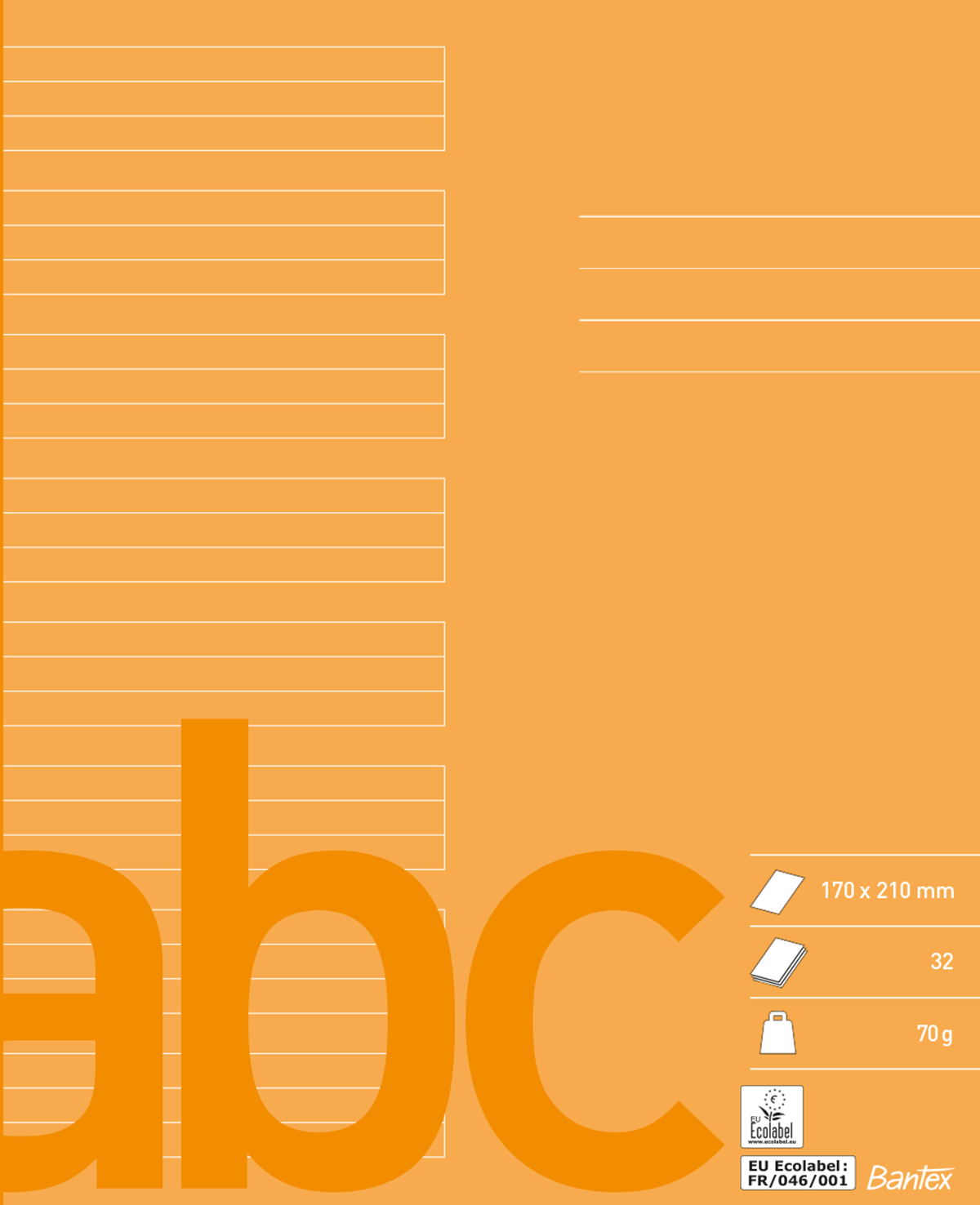 Skolhäfte i 70 g papper. Mått: 17x21 cm. Linjeringsdetaljer: 6+6+6 mm. 32 blad.