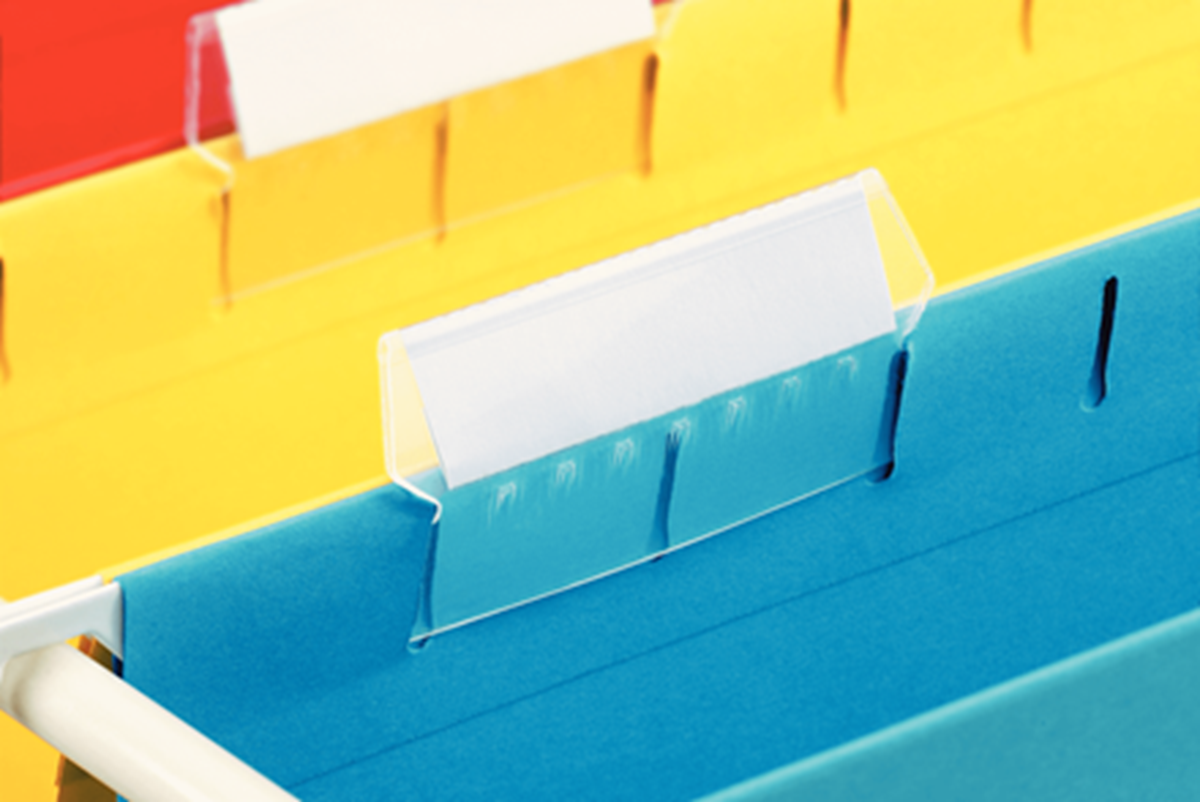 Esselte Classic med etikett 9 cm. Genomskinlig plastrubrikhållare inklusive pappersetiketter för alla Esselte hängmappar.