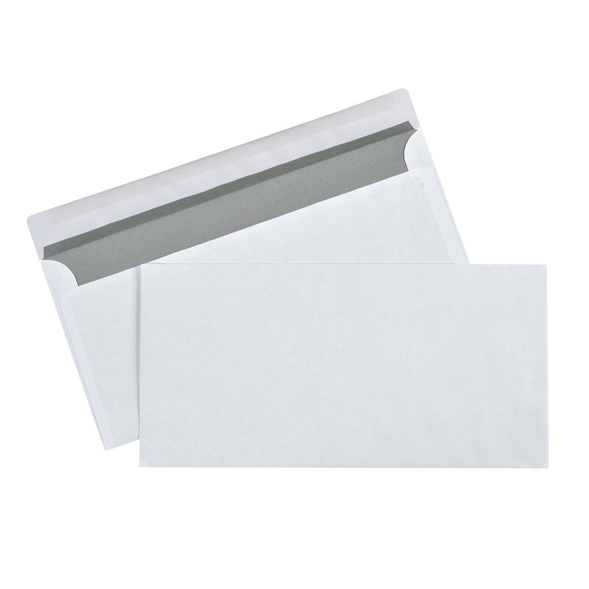 Självhäftande kuvert med Peel & Seal. Vitt kuvert med grått innertryck. Konsumentpackade.