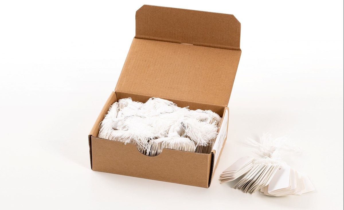Hängetiketter av vitt papper med vitt snöre. 1000 st/förp.