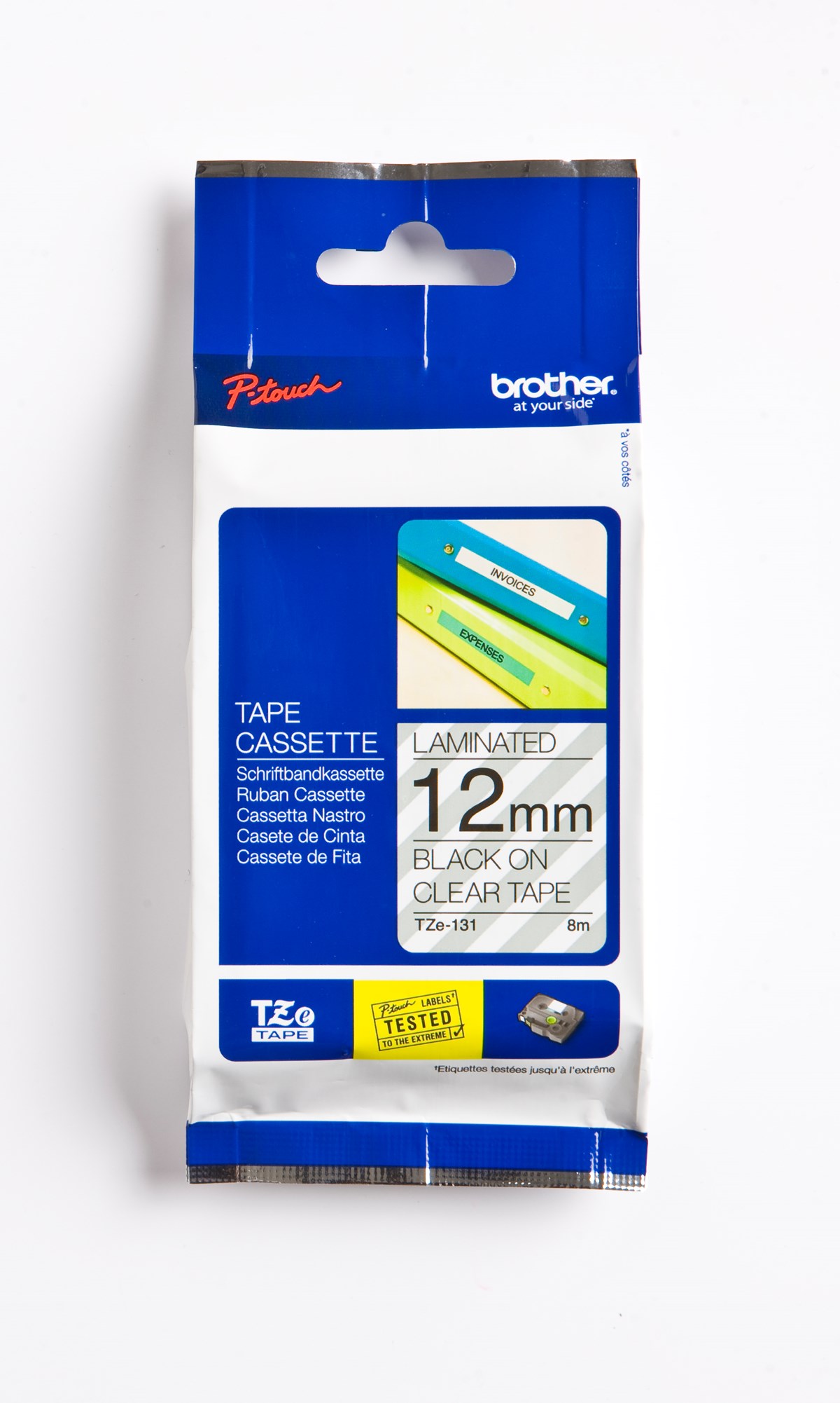 TZe tapekassetter är enkla att installera, finns i olika bredder, färger och material och säkerställer att din P-touch-märkmaskin uppfyller dina märkningsbehov. Mått: 12 mm x 8 m.
