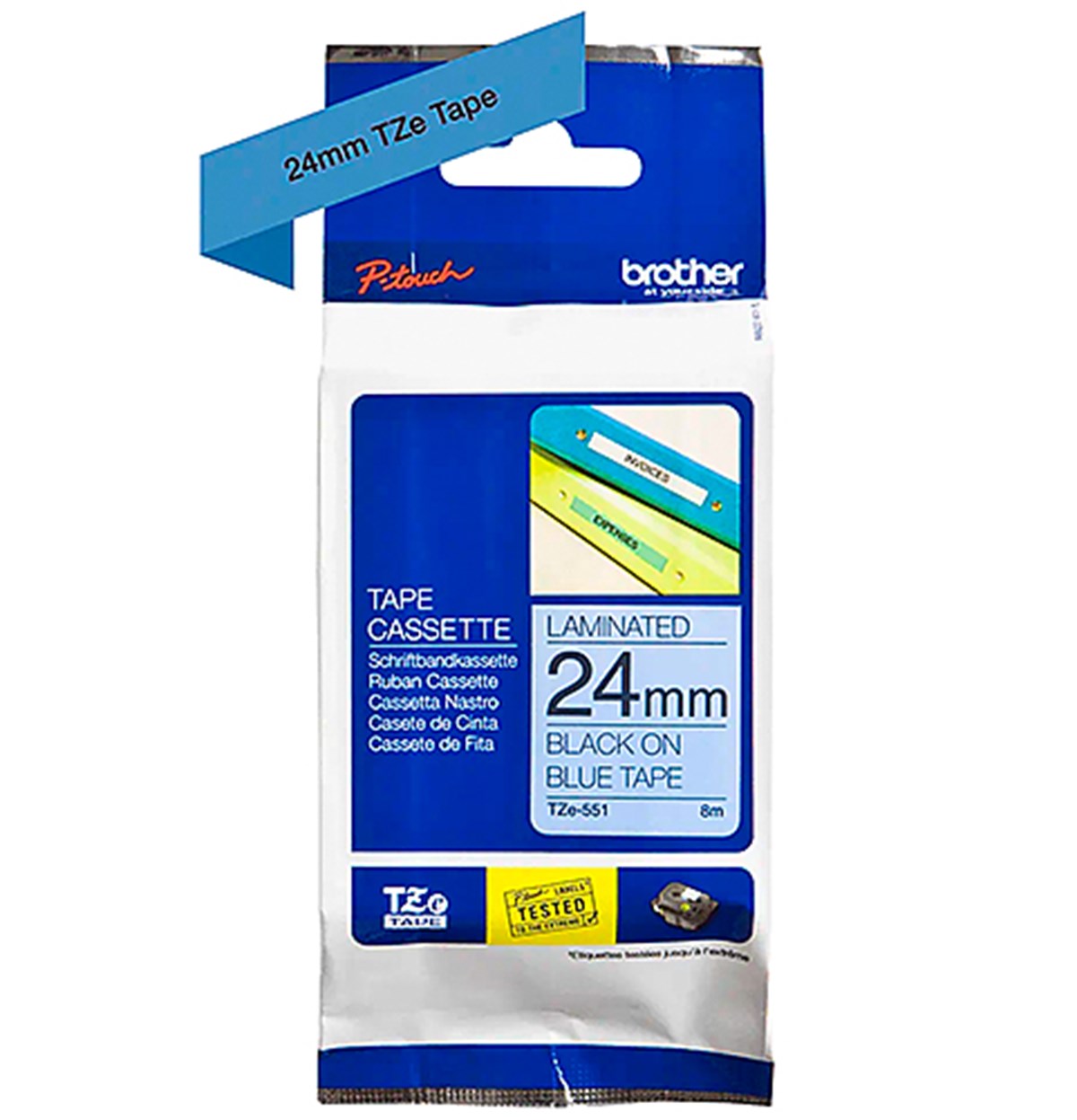 TZe tapekassetter är enkla att installera, finns i olika bredder, färger och material och säkerställer att din P-touch-märkmaskin uppfyller dina märkningsbehov. Mått: 24 mm x 8 m.