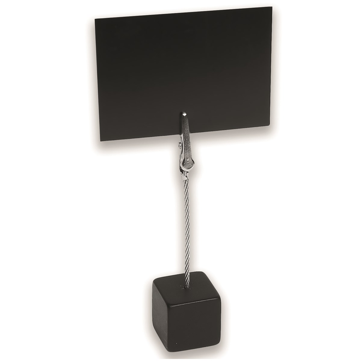 Krokodilklämma på stång med fot. Höjd: 11,5 cm. Fot: 2,5 x 2,5 cm.