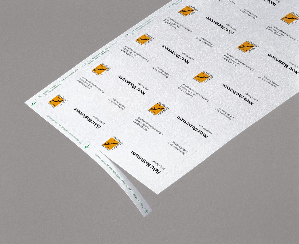 Visitkort på A4-ark med mikroperforerade kanter. Perfekt utskrift i alla typer av skrivare – bläckstråle, laser och kopiator. Format: 85 x 55 mm. 10 kort/ark.