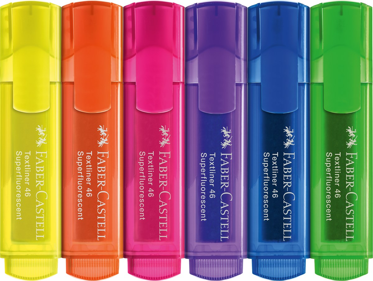 Högkvalitativ överstrykningspenna med tålig skuren spets som möjliggör skrivbredderna 1,2 och 5 mm. Vattenbaserat bläck lämpligt för de flesta papperstyper. Pennkropp och kork av 100% återvunnen plast. Förpackning av återvunnen papp. Innehåller 6 superfluorescerande färger.