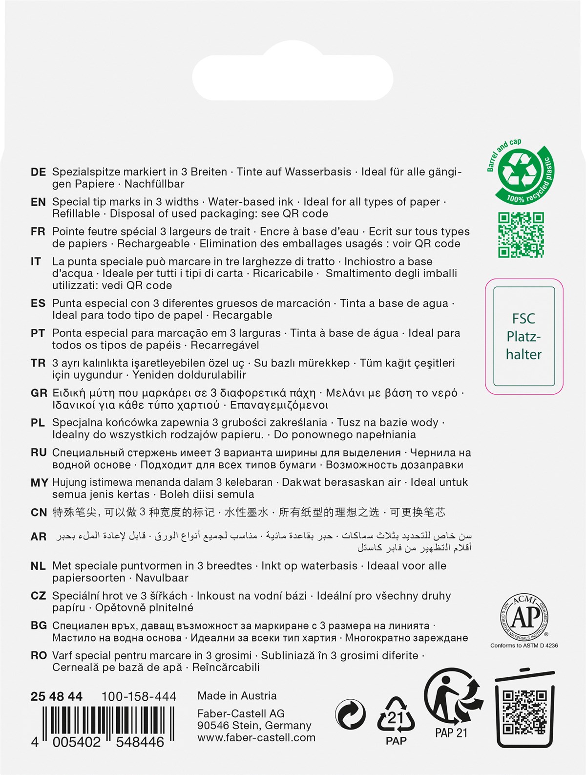 Textliner 48 är den klassiska överstrykningspennan med ett superfluorescerande pigment. Skuren spets ger 3 olika linjebredder på 1, 2 och 5 mm. Påfyllbar med vattenbaserat bläck. Huv och pennkropp av 100% återvunnen plast. Förpackning av 100% återvunnen papp.