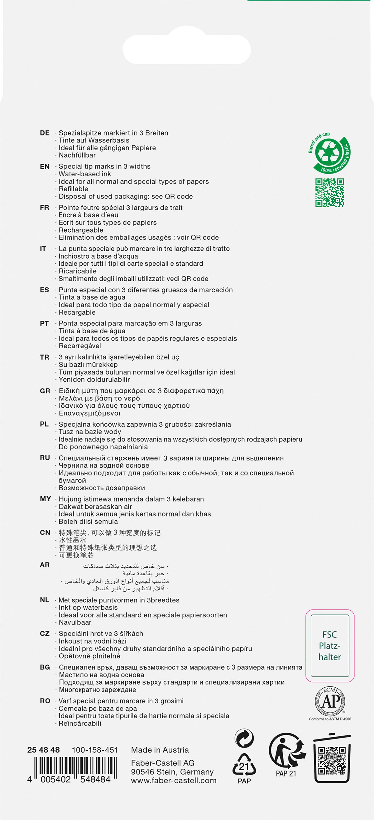 Textliner 48 är den klassiska överstrykningspennan med ett superfluorescerande pigment. Skuren spets ger 3 olika linjebredder på 1, 2 och 5 mm. Påfyllbar med vattenbaserat bläck. Huv och pennkropp av 100% återvunnen plast. Förpackning av 100% återvunnen papp.