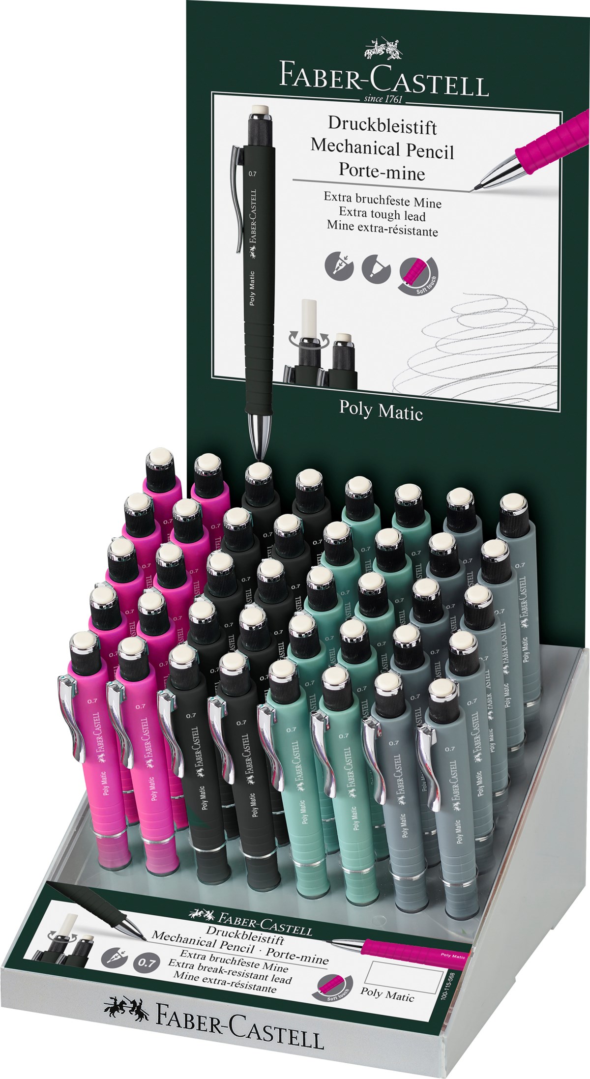 Ergonomisk stiftpenna med Soft-Touch-yta. Extra brytsäkra stift på 0,7 mm (B). Extra långt radergummi som skruvas ut. Automatisk stiftframskjutning. Perfekt i fickan tack vare smart tryck-funktionen. Blandade färger.