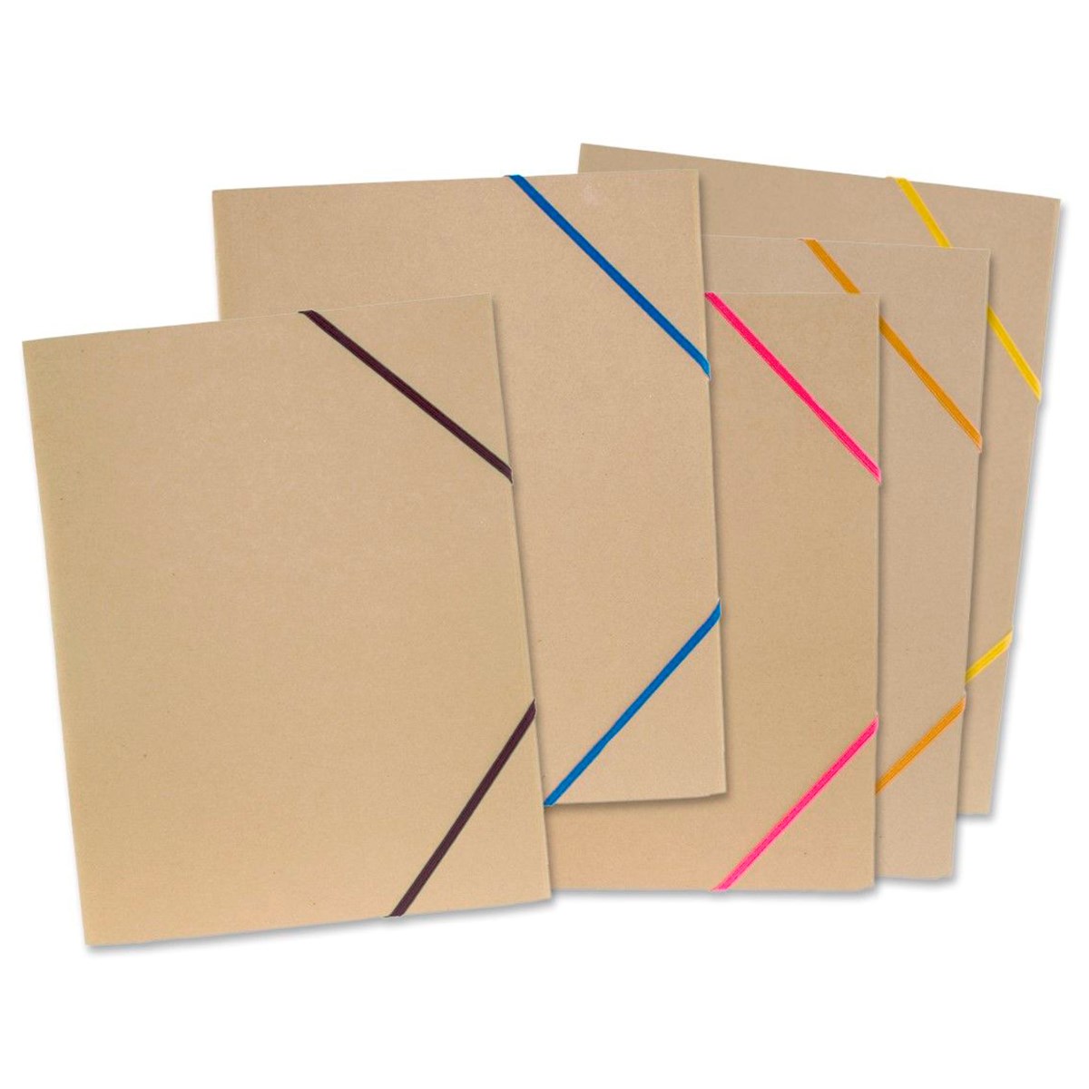 A4-gummibandsmappar tillverkade av 100% återvunnet 400 grams naturpapper. Dessa mappar har tre klaffar och ett färgat gummiband för säker förslutning. Blandade färger på gummisnoddarna.