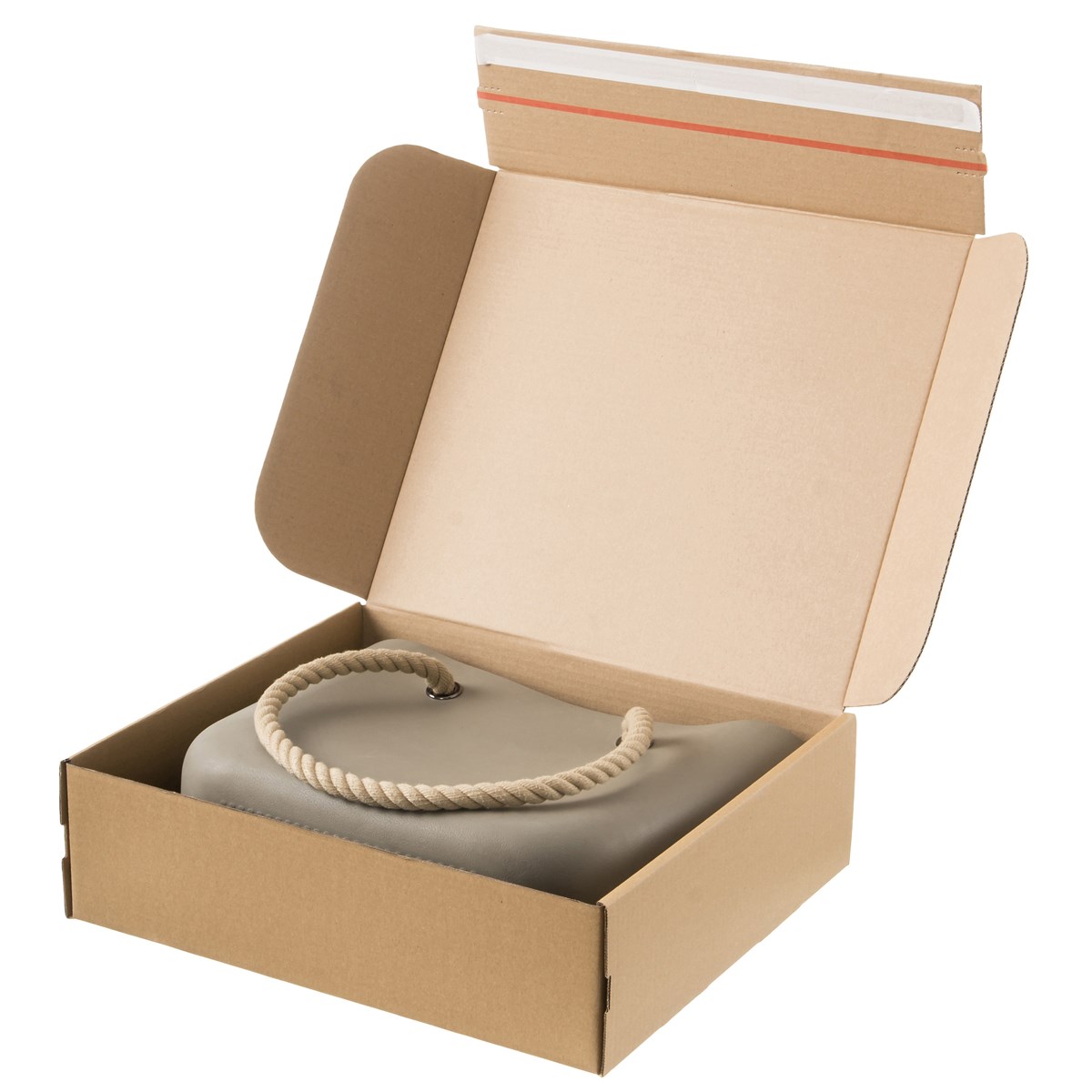 Lättpackad låda med inbyggd tejpremsa vilket innebär att den kan stängas och förslutas utan behov av ytterligare tejp. Anpassade efter Postnords storlekskrav för varor på max 2 kilo som skickas till kundens brevlåda, postbox eller fastighetsbox. Fefco 427. Kan levereras med tryck. 20 st/förp.