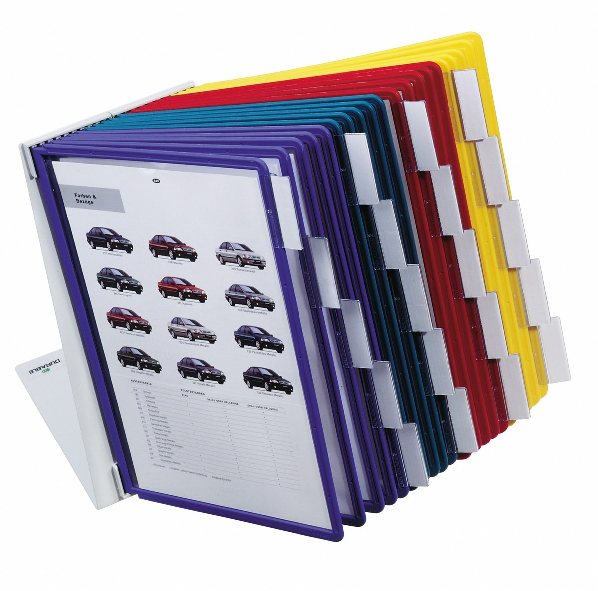 Slitstarkt bordsställ komplett med 20 st A4-paneler och rubrikhållare. Fot av metall, paneler och rubrikhållare av polypropylen. Färg på panelerna: röd, gul, grön och blå, fem av varje. 5 års garanti.