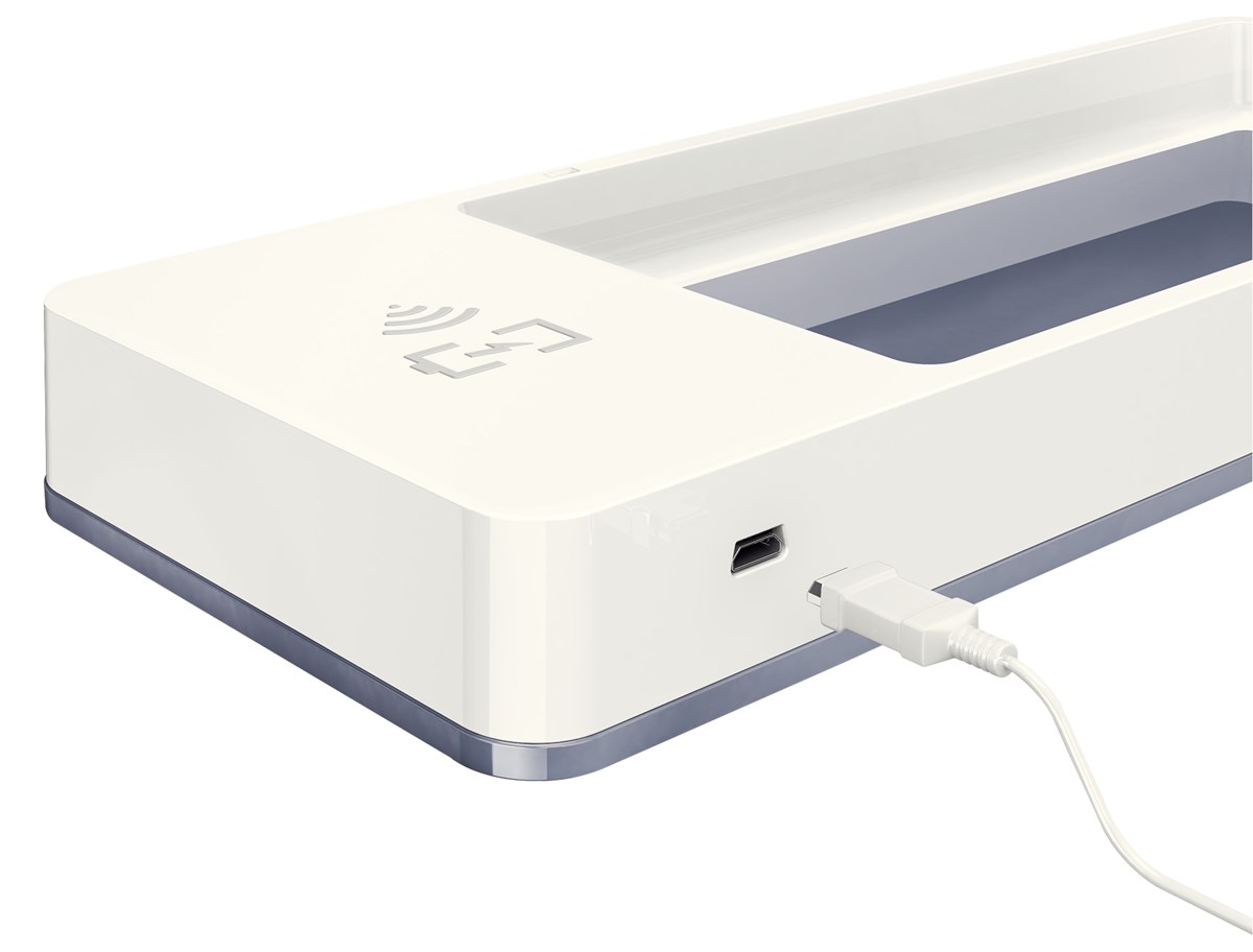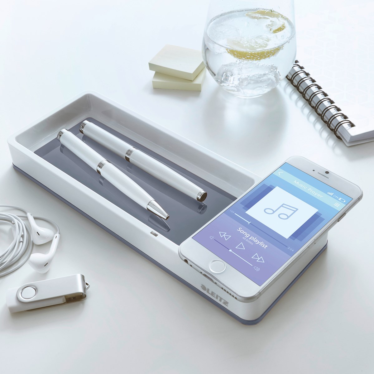 Pennfack med praktisk induktionsladdare. Med den trådlösa Qi-laddaren kan du ladda din mobiltelefon utan kabel (kräver att telefonen stödjer detta). När telefonen är fulladdad slutar enheten att ladda. USB-kabel för strömtillförsel medföljer. Mått: 266x28x101 mm.