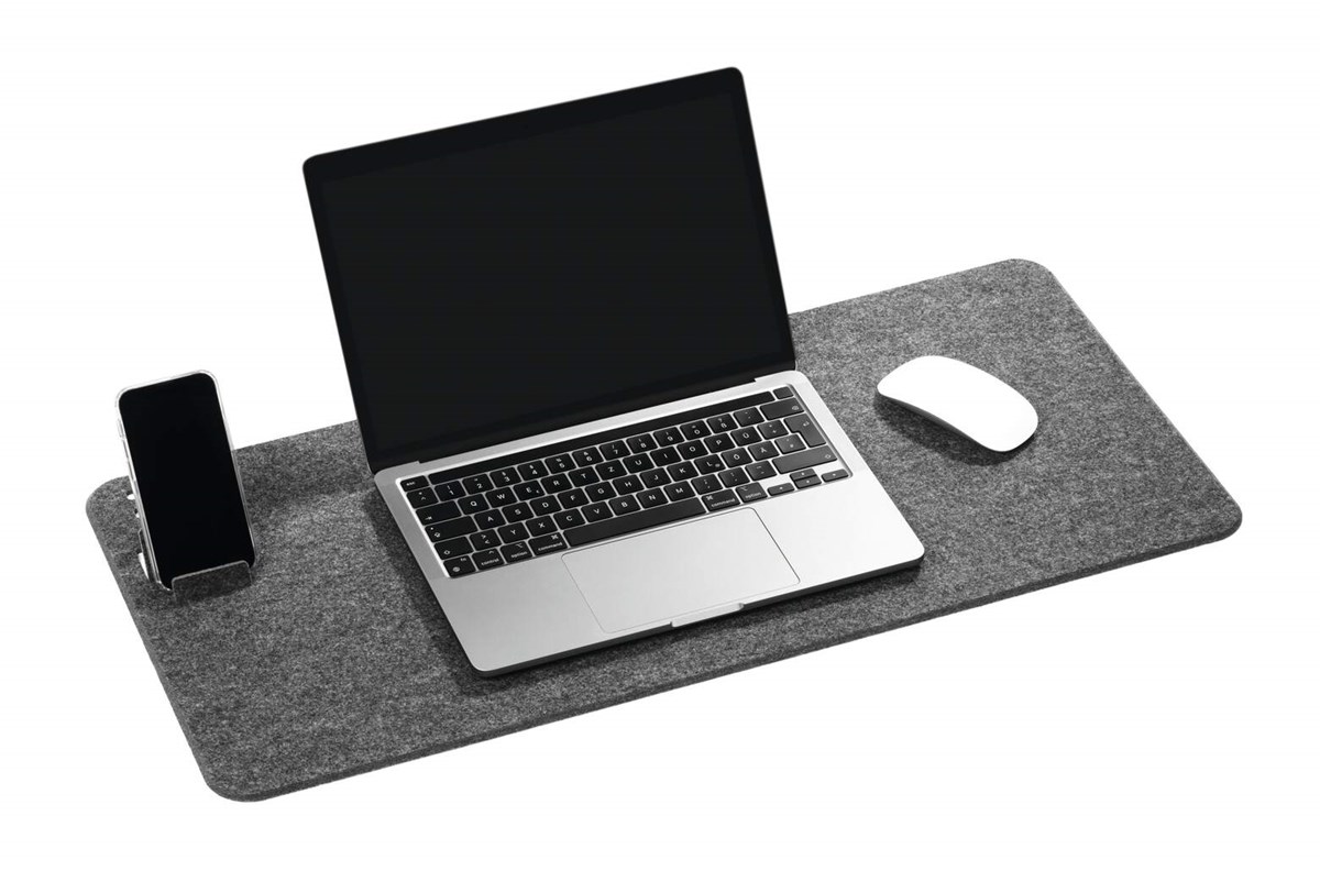 Skrivunderlägg tillverkad av 60% återvunnen PET filt med uppfällbar mobilhållare. Underläggets behagliga yta ger en skön skrivkänsla och skyddar samtidigt bordet mot repor och märken. Mobilhållaren kan enkelt fällas upp och tryckas ner igen i mattan utan att den syns och underlägget kan vikas ihop på mitten, perfekt för ett hemmakontor Skrivunderlägget är tillverkat av ett material som är lätt att hålla rent. Ytan kan torkas av med en fuktig trasa. Filtmaterialet är ljuddämpande och har därmed en positiv effekt på akustiken. Hållbar förpackning: utformad för att spara resurser och fri från plast.