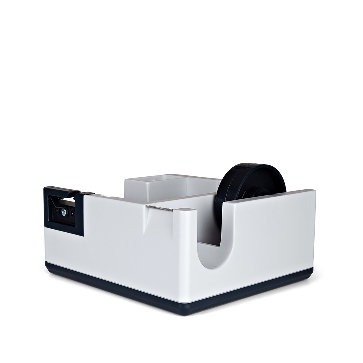 Kombinerad hållare för både tejp och presentband eller snöre samt med praktiska fack för sax, pennor och gem. Idealisk för presentinslagning då man har allt som behövs till hands. Hålls på plats på bordsytan genom sin tyngd och gummerade undersida vilket gör att tejp och presentband lätt kan rivas av med en hand. Ett tandat metallblad skär av tejpen till önskad längd.