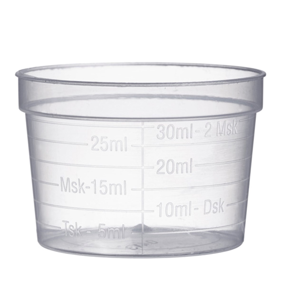 Medicinbägare för engångsbruk tillverkad av mjuk plast av polypropen. Graderad upp till 30 ml.