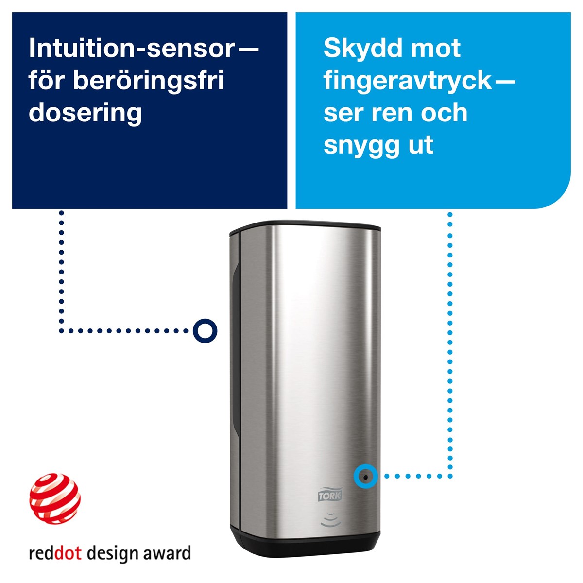 Beröringsfri, sensorstyrd hållare i rostfritt stål för Tork skumtvål. Hög kapacitet, en skumtvålsflaska ger 2500 doseringar. Hölje i lätt borstat rostfritt stål med skydd mot fingeravtryck ser snygg ut och förblir ren. Fönster på båda sidor för att man lätt ska kunna se när refillflaskan behöver bytas ut. Dokumenterat enkel att använda både för användare och städpersonal av Svenska Reumatikerförbundet. Mått: H27,8xB11,6xD13 cm. Drivs med 4 st LR14/typ C-batterier.