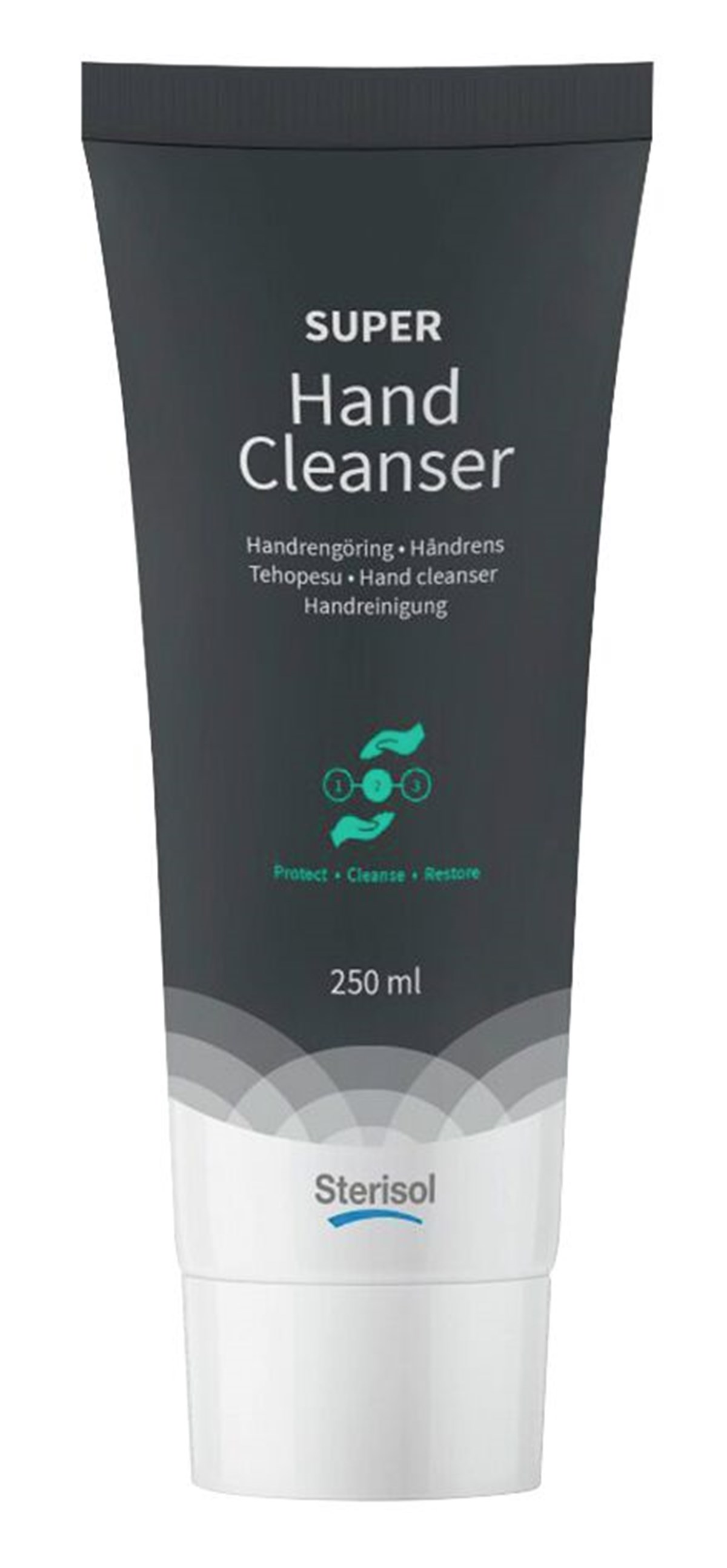 En effektiv handrengöring som inte skadar hudens normala barriärfunktion. Den innehåller vegetabiliska oljor, som både löser smuts och återfettar huden. Sterisol Super Handrengöring innehåller även ett friktionsmedel som mekaniskt hjälper till att skrubba bort envisa orenheter. Den är därför mycket lämplig i samband med arbete i miljöer där man kommer i kontakt med smuts, olja och andra svårtvättade ämnen.