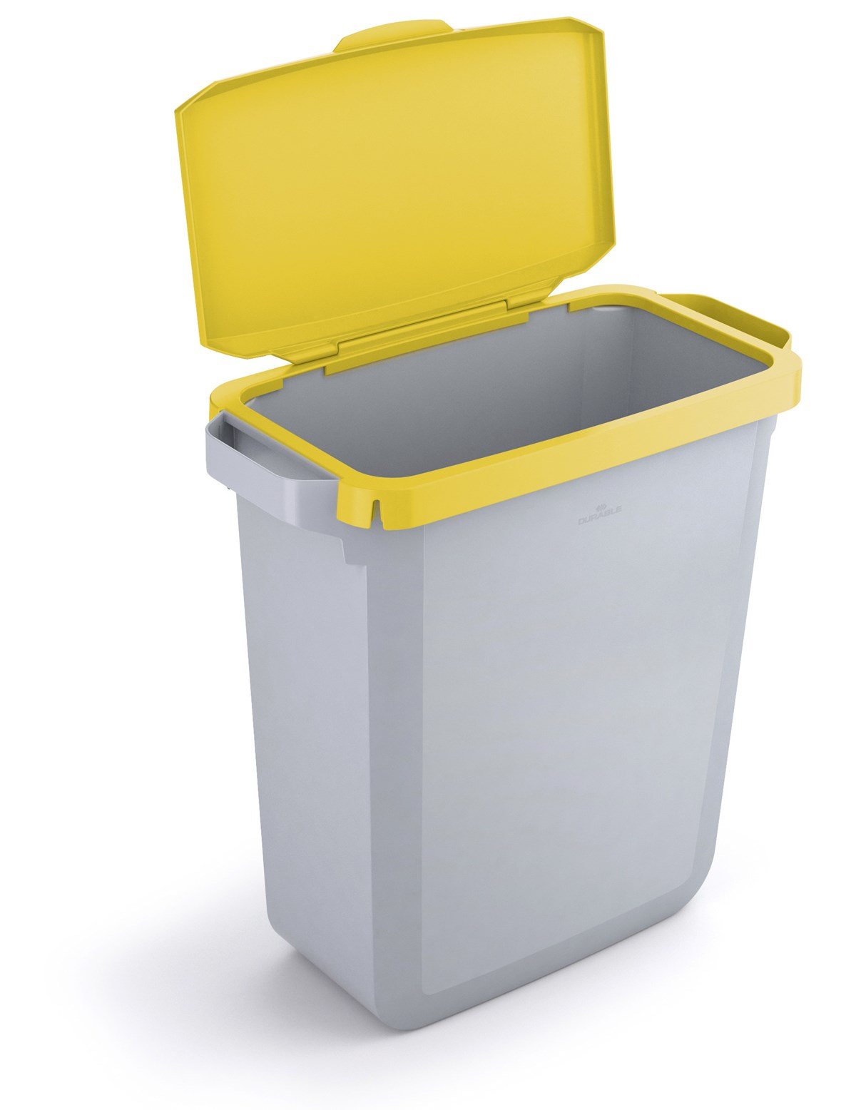 Komplettera avfallstunnnan DURABIN 60 med ett gångjärnslock som stannar i uppfällt läge och kan hanteras med en hand. Det gör det lätt att slänga skräpet och källsortera för återvinning. Locket kläms fast på tunnans kant.