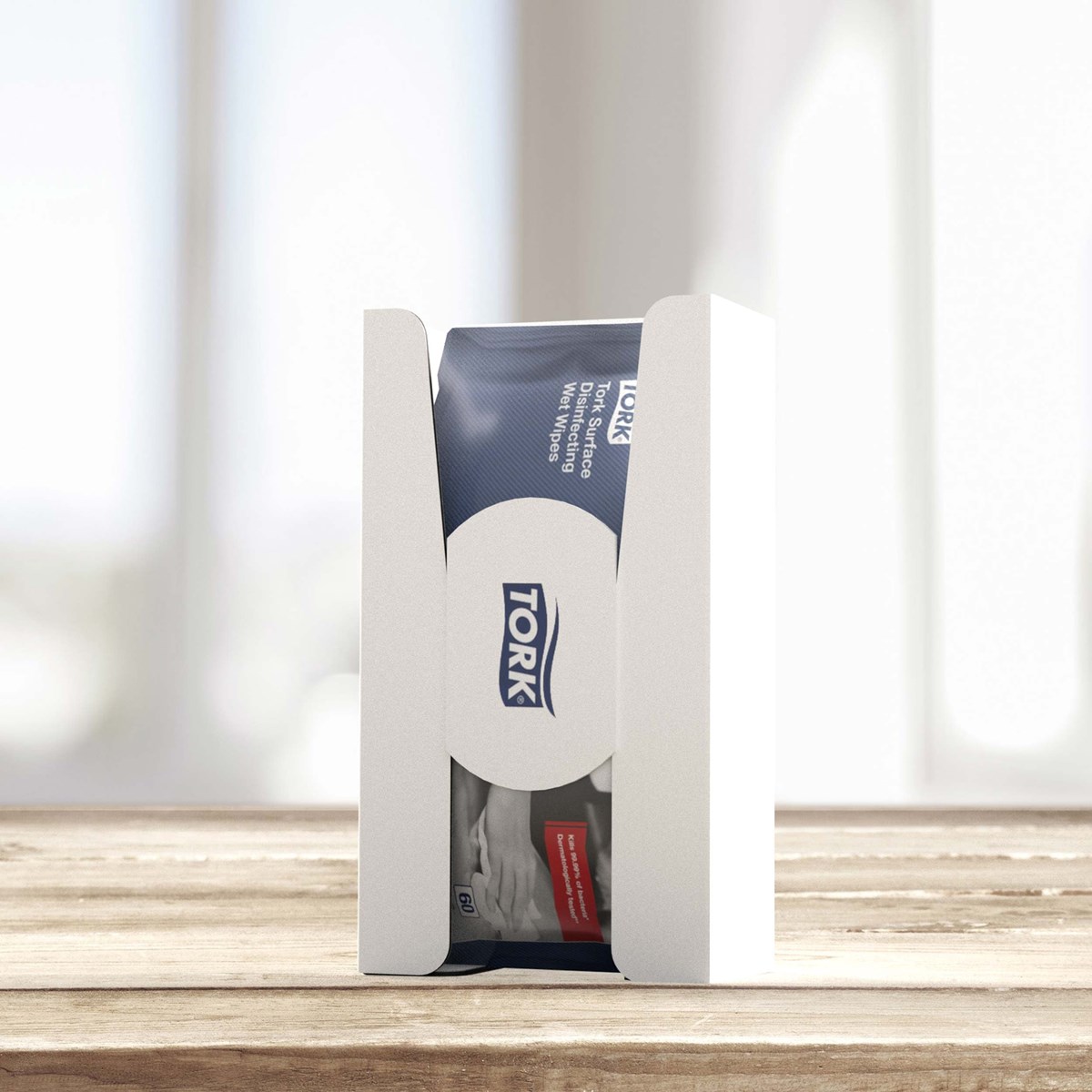 Dispenser Tork Våtdukar för ytdesinfektion. Kan väggmonteras eller användas som en fristående dispenser för flexibel placering. Det återförslutbara locket glider lätt på plats och håller våtdukarna säkert på plats. Tillverkad av aluminium, med borrhål och medföljande skumtejp för valfri montering.