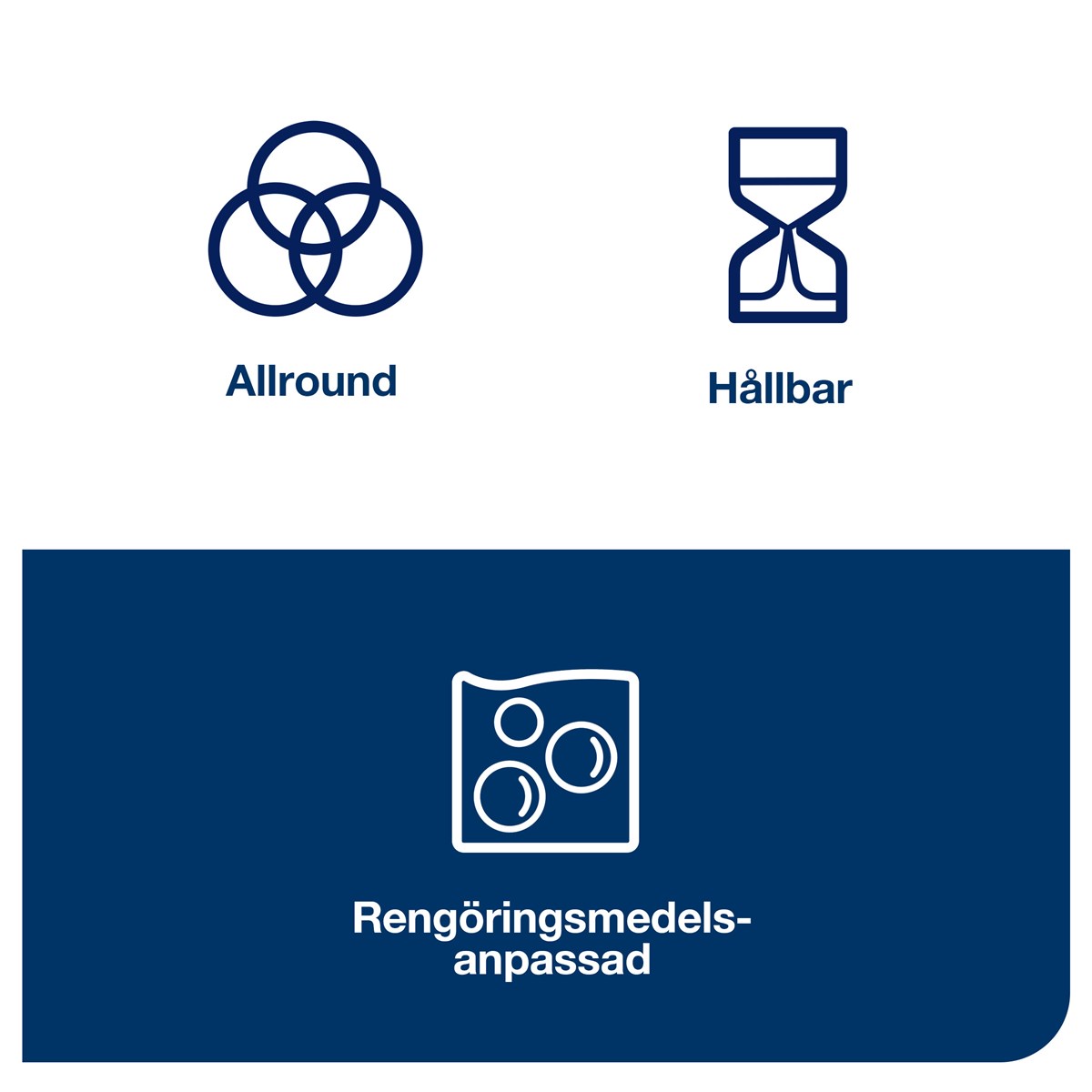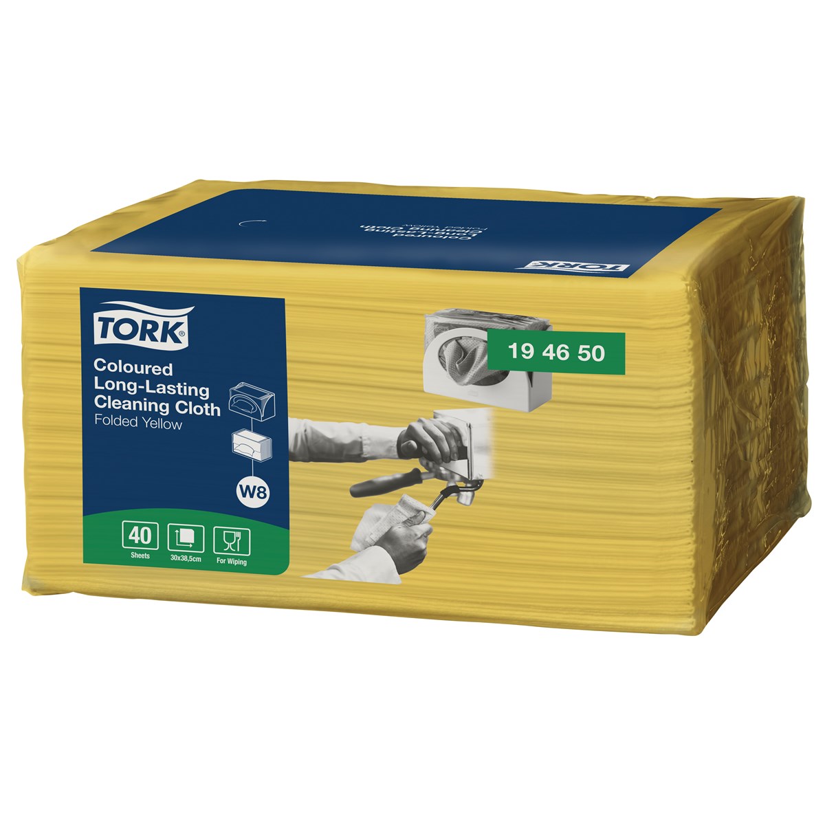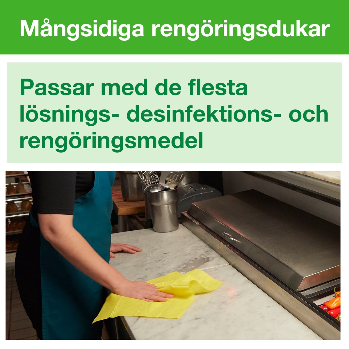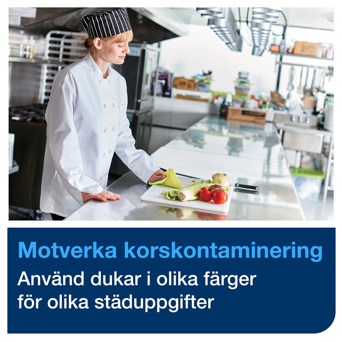 Tålig städ- och rengöringsduk i nonwovenmaterial som kan användas gång på gång utan att gå sönder. Finns i fyra olika färger för att förhindra korskontaminering. Godkänd för livsmedelskontakt. Mått: 30 x 38 cm. 40 dukar/förp.