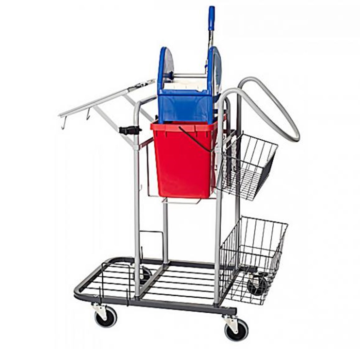 Städvagn Trio är en vagn med plastpress och ergonomiskt handtag. Vagnen har svabbpress, 25 l hink, 2 st korgar, 2 st skafthållare, 2 st stativhållare, 1 st 125 l sopsäckshållare, krokar för moppsäck samt 4 st 100 mm hjul varav 1 st bromsat. L 980 mm, B 570 mm, H 1030 mm.