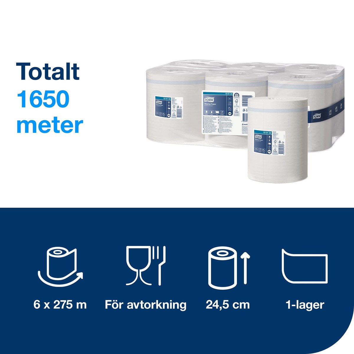 Våtstarkt, centrummatat papper. Passar perfekt för lättare avtorkning och handavtorkning. Har slutindikator – När det är 4 m papper kvar, syns blå linjer som talar om att det är dags att byta rulle. Godkänt för livsmedelskontakt. 1-lag. Passar till Tork hållare M2. 275 m, bredd 24,5 cm, 1,6 kg/rulle. 6 rl/förp.