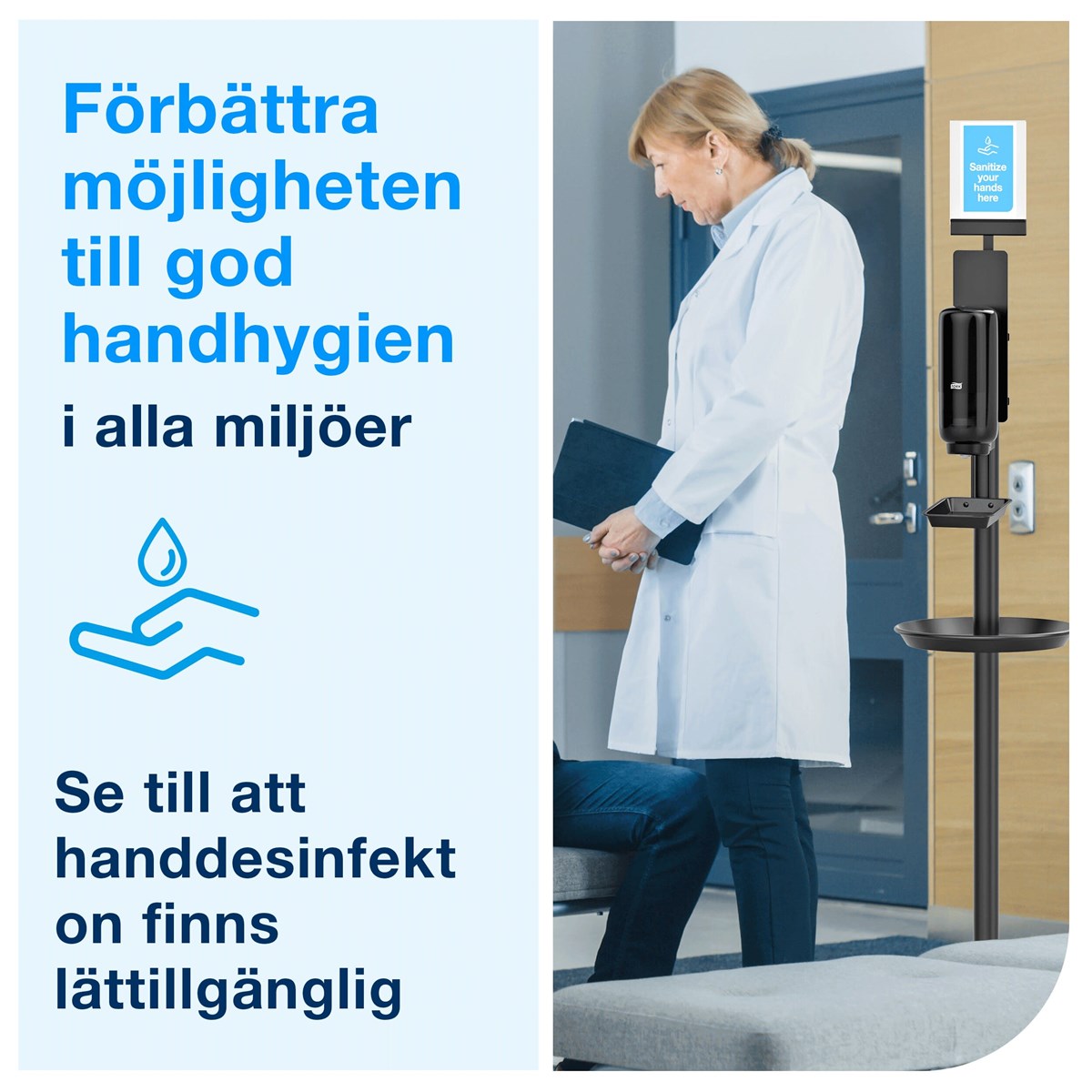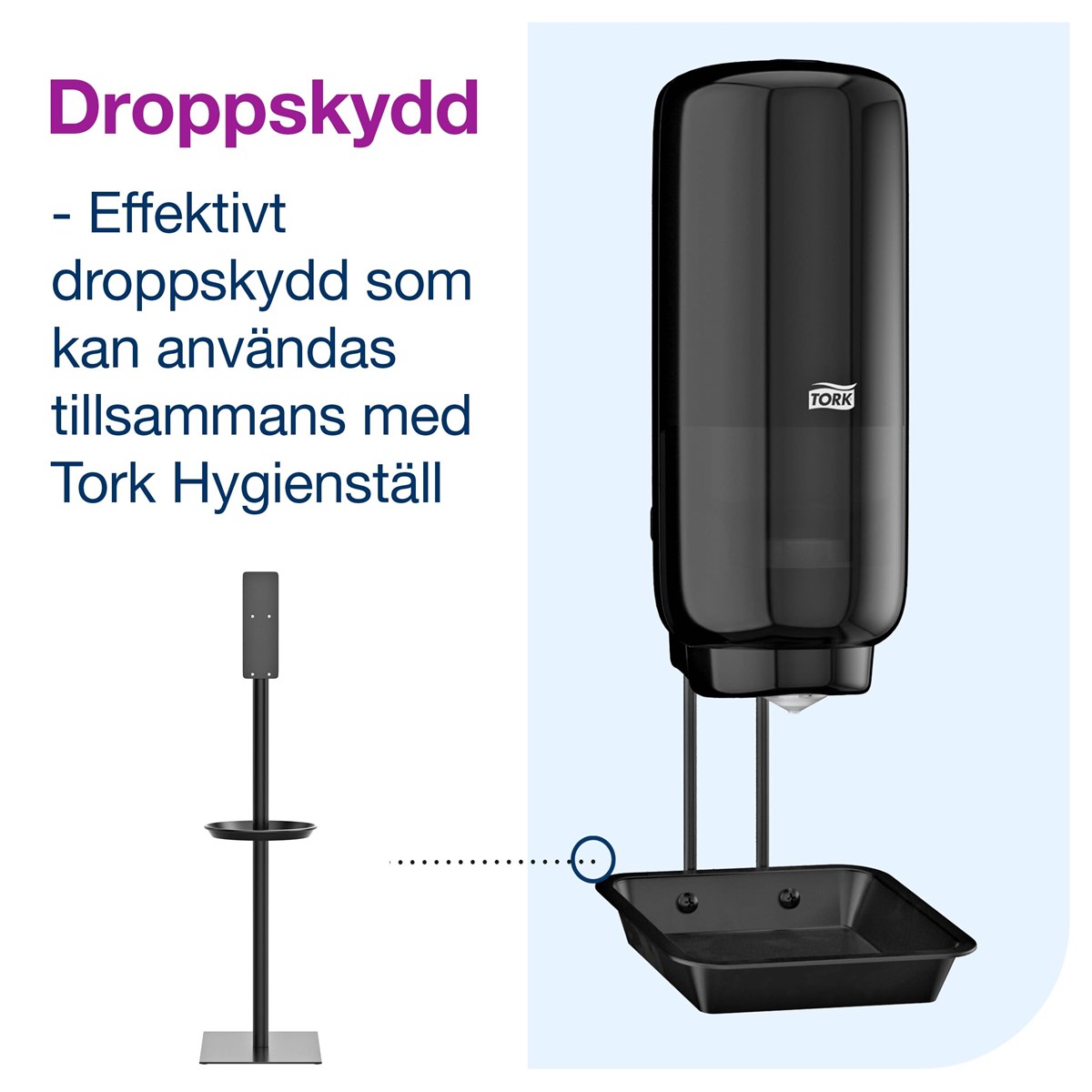Förhindra spill av handdesinfektion och minska halkrisken med Tork Droppskydd. Detta effektiva skydd passar alla Tork Hygienställ och hjälper till att hålla golv fläckfria. Bäst av allt är att designen är så diskret, vilket gör droppskyddet knappt märkbart när gäster använder handdesinfektionsdispensern. Droppskyddet är dessutom robust för att kunna användas under lång tid och det minskar behovet av dagligt underhåll.Design: Elevation. B 14.2 cm. H 21.2 cm. D 14.2 cm. Material: Metall/Plast. Färg: Svart. Passar med Tork S1 refiller.