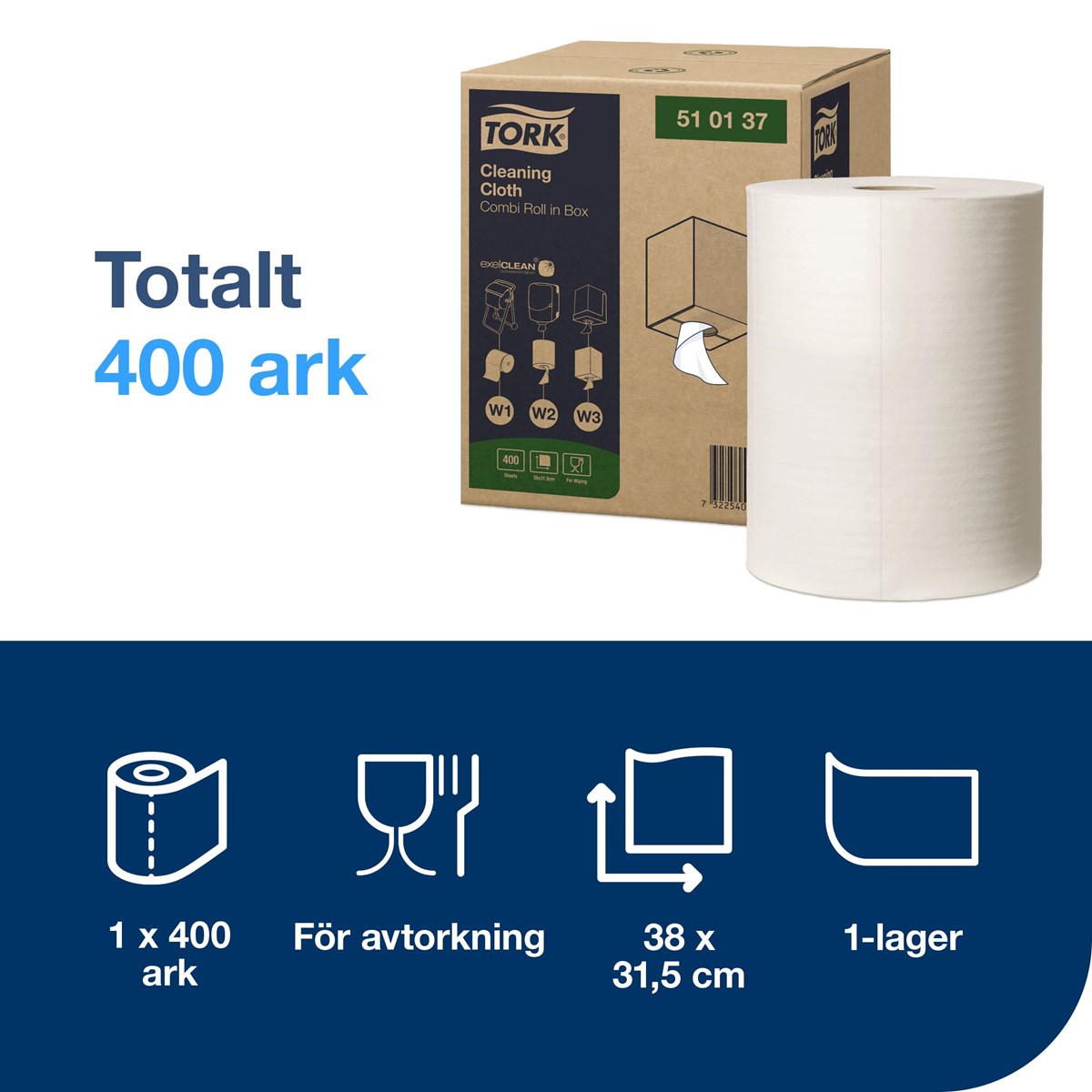 Tork Rengöringsduk mjuk rulle box W1/W2/W3 vit 400/fp