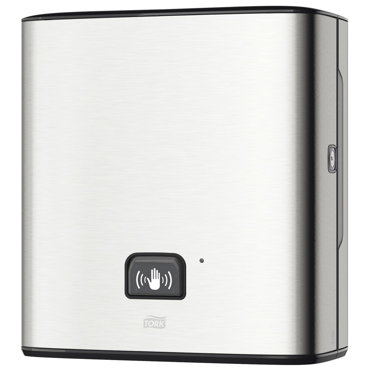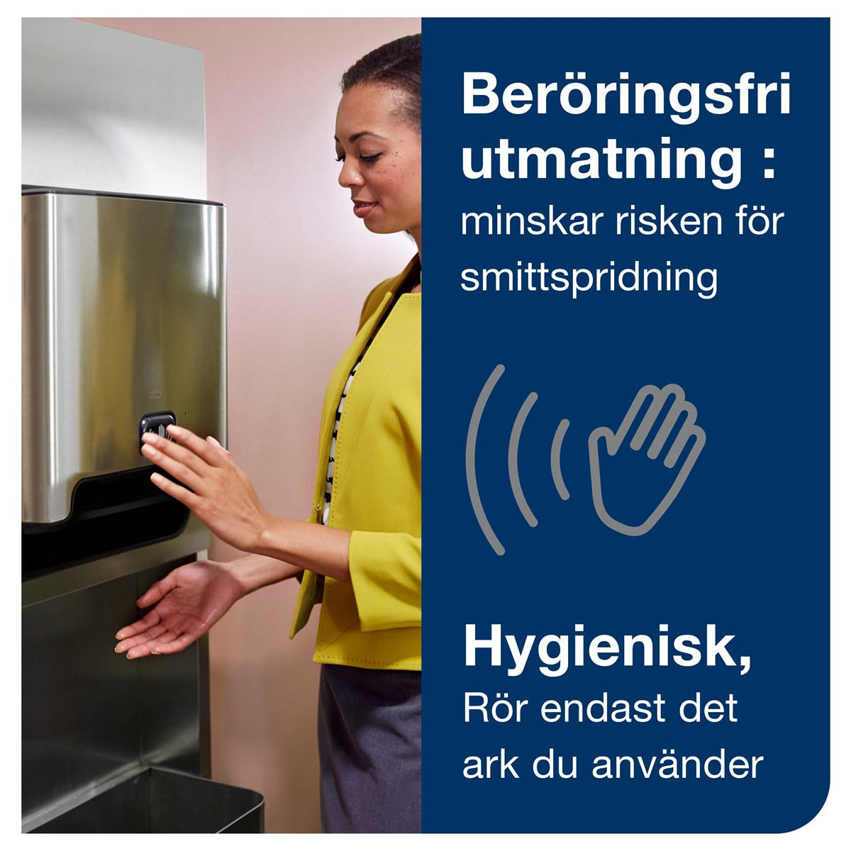 Rostfri, sensorstyrd hållare för handduksrullar. Känner av besökarens händer och matar då fram en handduk. Beröringsfri utmatning av en handduk i taget minskar förbrukningen och förbättrar hygienen. Enkelt underhåll med LED-påfyllningsindikatorn som visar när påfyllning behövs. Justerbar handdukslängd innebär att du kan välja den storlek som passar bäst i din verksamhet. Hög kapacitet. Mått: 37,3x34x20,4 cm. Drivs med tre 3 stycken LR20-batterier.