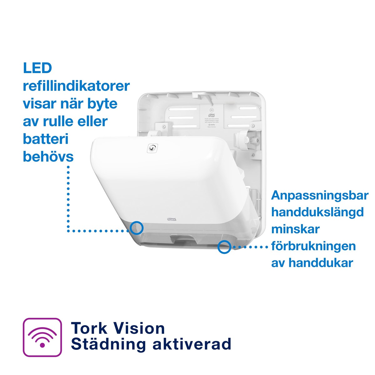 Sensorstyrd vit hållare för handduksrullar. Känner av besökarens händer och matar då fram en handduk. Enkel och snabb påfyllning. Hög kapacitet, idealisk för trafikerade toalettutrymmen i olika miljöer. Drivs med 3 st LR20-batterier. Mått: (H x B x D) 36,8 x 33,1 x 20,6 cm.