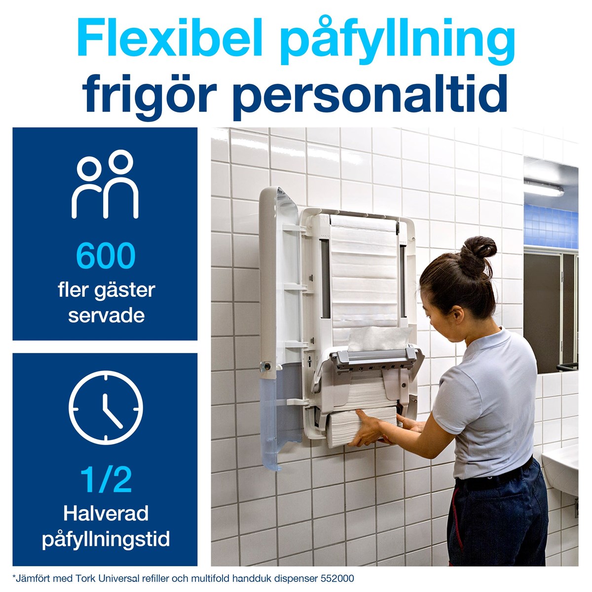 250 % högre kapacitet med 2 100 pappershanddukar i en slimmad behållare För välbesökta toalettutrymmen Smidig utmatning på tre sekunder Komprimerade buntar sparar plats på lager och på städvagnar