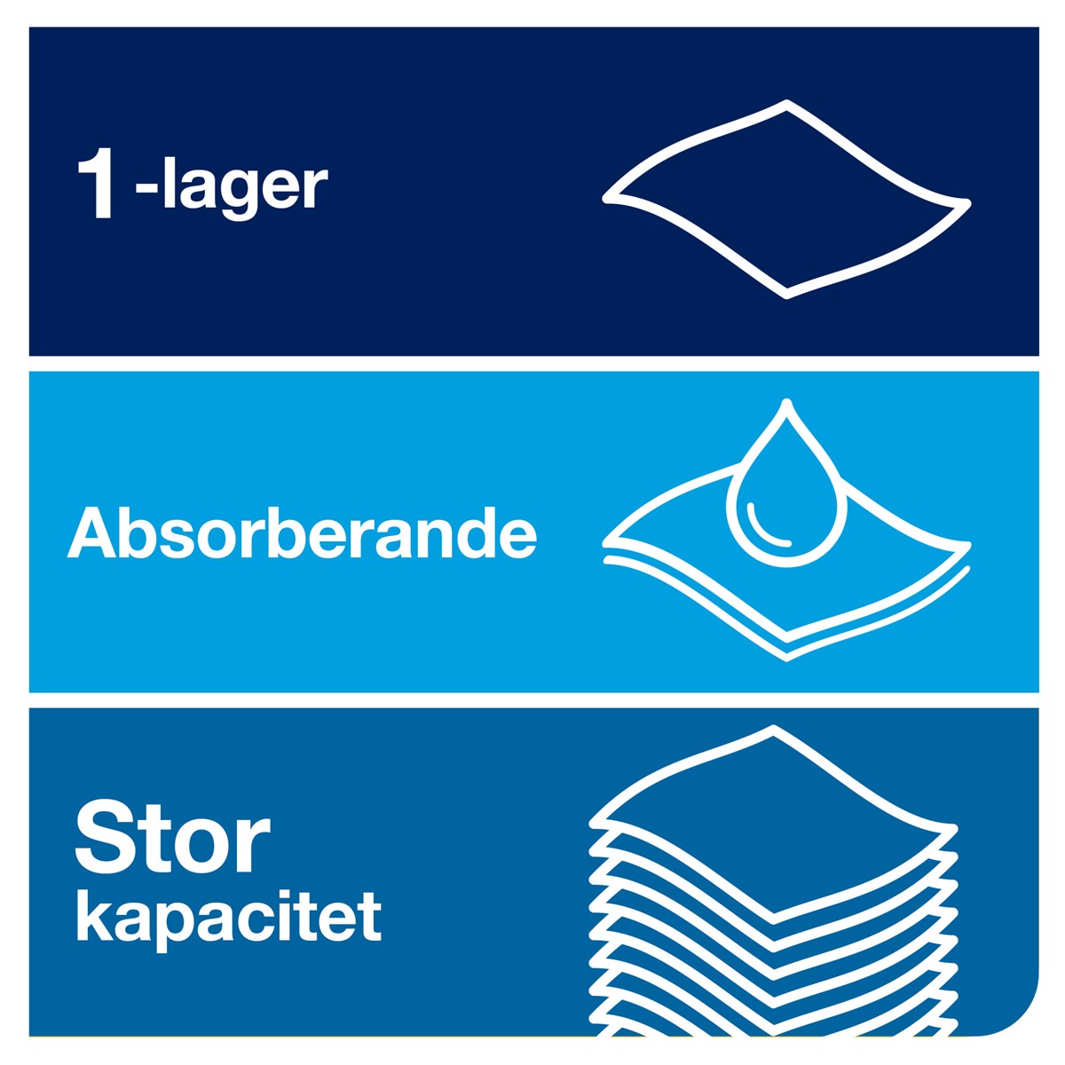 Idealisk för välbesökta toalettutrymmen 280 m lång – särskilt ekonomisk Tork Easy Handling - Enkelt att öppna förpackning, enkel att fälla ihop och okomplicerad att transportera Europeiska unionens märkning garanterar att produkter ska uppfylla höga miljökrav