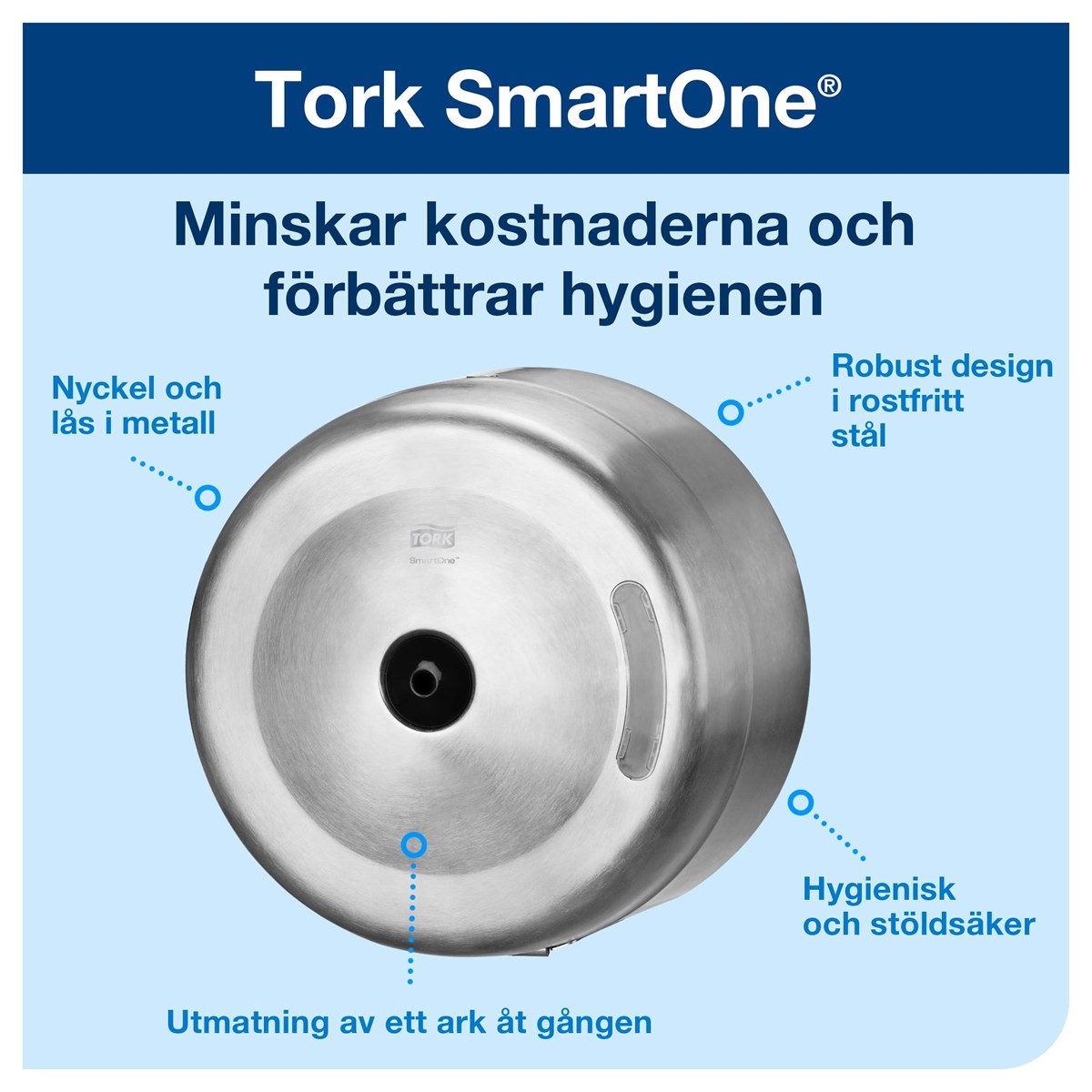 Tork SmartOne® Dispenser Toalettpapper är en effektiv och mycket robust dispenser av rostfritt stål som är lämplig för krävande toalettutrymmen med hög besöksfrekvens. Utmatningen av ett ark i taget hjälper till att minska förbrukningen med upp till 40 % jämfört med vanliga dispensrar för jumborullar, vilket innebär fler besök per rulle.