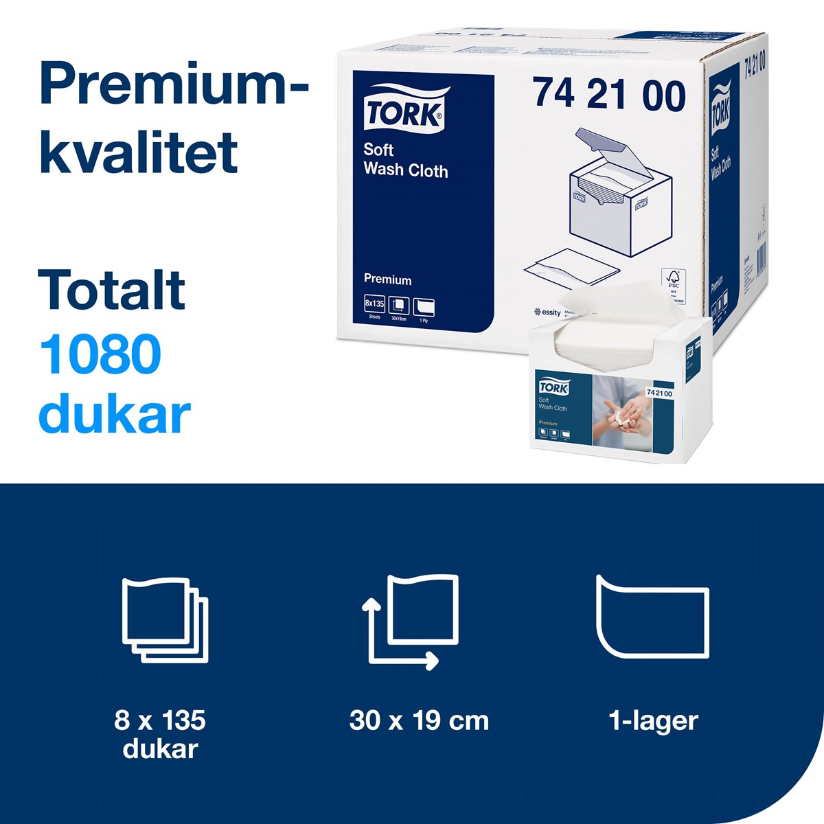 Förbättra patientvården med den starka och mjuka Tork Mjuk Tvättlapp som passar perfekt när man tvättar patienten med vatten och en mild tvål. 8 förpackningar, med 135 ark vardera. 1-lagers. Premium-kvalitet. Vikt storlek: D 17 cm B 19.2 cm. Ovikt storlek: D 30 cm B 19.2 cm.